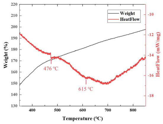 The TG-DSC curves of an electrodeposited Ni foil at a heating rate of 5 °C/min.