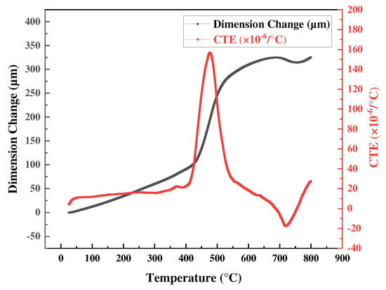 The TMA data are shown in Figure 3. A change in linear length was apparent to approximately 400 °C, followed by a sharp increase and then a slower increase after 500 °C. Thermal expansion coefficients (CTEs) were calculated at various points; the CTE increased sharply to 160 × 10−6/°C between 400 °C and 600 °C, followed by a decrease, demonstrating the changes in the temperature-dependent material more clearly than the DSC results. In previous studies, the bulk material superplastic deformation temperature was generally 0.5 of the melting temperature (Tm), although, for electrodeposited nanocrystalline Ni, it was reported to be 0.36 Tm [45,46,47]. The TMA data confirmed that nanocrystalline Ni underwent rapid grain growth from the nano- to the micro-scale over a specific temperature range indicated by changes in the CTE, which were dramatic near the superplastic deformation temperature. Thus, superplastic deformation was predicted more accurately by the TMA than by DSC.