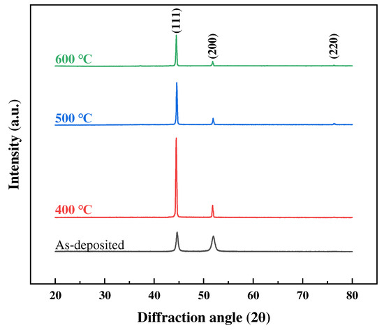 Based on the TG-DSC and TMA data for electrodeposited Ni foils, annealing temperatures of 400 °C, 500 °C, and 600 °C were selected. The DSC results indicate that significant microstructural changes occur between 476 °C and 615 °C, which aligns with the critical transformations observed in the TMA analysis. Specifically, the TMA data suggest that a transition influencing the material’s deformation behavior occurs between 400 °C and 600 °C. This temperature range is further supported by previous studies, which have reported that nickel exhibits superplasticity within these conditions [32,33]. In previous studies, electrodeposited Ni coatings exhibited structures similar to those of amorphous materials in the as-deposited state but, after heat treatment, developed a crystalline structure resembling that of bulk Ni [48,49]. The XRD results for Ni foils annealed in a high-purity hydrogen atmosphere are shown in Figure 4. In the as-deposited state, electrodeposited foils exhibited peaks similar to those of amorphous materials, but crystalline structures began to form at temperatures above 400 °C. For all samples, electrodeposited Ni exhibited the strongest diffraction intensity from the (111) plane, but the intensity of the (220) peak increased at higher annealing temperatures. These results are consistent with typical XRD results for electrodeposited Ni foils [50,51].