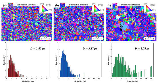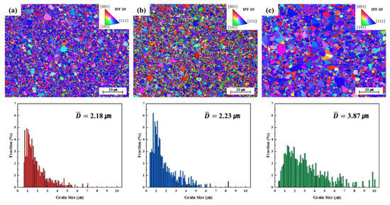 The EBSD maps and the grain size distribution histogram of fractured tensile samples at (a) 400 °C, (b) 500 °C, and (c) 600 °C.
