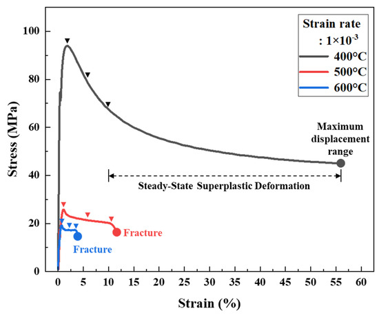 The tensile test mode of a TMA (maximum load, 1.0 N) is generally used to evaluate low-strength polymer films. However, a stress of 100 MPa can be applied to a metal sheet of thickness 10 μm and width 1 mm, which is a lower stress level than that required for the superplastic deformation of bulk metals. The grain size required for superplastic deformation of bulk materials is typically less than 10 μm, and the strain rate for superplastic deformation is typically 10−1 to 10−5 s−1 [59,60,61]. The strain rate was selected by reference to previous studies that used strain to induce superplastic deformation. In most cases, after annealing, the grain size remained less than 10 μm from 400 °C to 600 °C. To analyze the superplastic properties of Ni foils, samples with a thickness of 10 μm, width of 1 mm, and length of 8 mm were prepared. TMA analysis was performed at 400 °C, 500 °C, and 600 °C, attained at a heating rate of 5 °C/min; the temperature was held for 30 min and deformation occurred at a strain rate of 1 × 10−3 s−1. The stress-strain curves obtained at each temperature are shown in Figure 6.