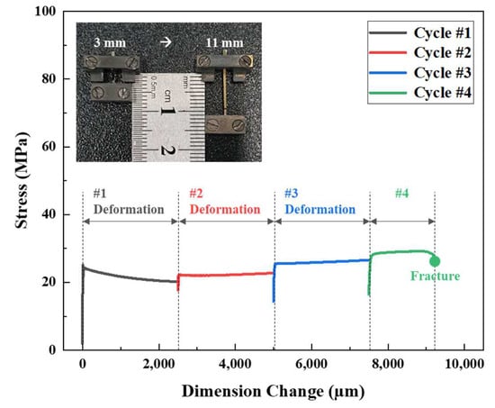 The maximum elongation could not be determined because it exceeded the maximum displacement measured by the TMA. The maximum TMA measurement range is 3.2 mm (the travel range). When displacement increases rapidly, that displacement may exceed the equipment specifications, rendering reliable measurements impossible. Based on previous experimental results, stable measurements were feasible within a displacement of 2.5 mm, and this limitation was considered when designing the experiment. However, a single 2.5 mm displacement did not yield the typically reported elongation of 200–300%. Thus, we used repeated deformations to accumulate the total elongation. Therefore, the method was customized to perform maximum elongation testing of electrodeposited Ni foils. To analyze the elongation-to-failure behavior of Ni foils, samples of 10 μm thickness, 1 mm width, and 3 mm length were prepared. Under the same conditions used in the temperature-specific superplastic experiments, the temperature was increased to 400 °C at a heating rate of 5 °C/min and held for 30 min, followed by deformation at a strain rate of 1 × 10−3 s−1, with a maximum displacement of 2.5 mm/cycle. After deformation attained approximately 2.5 mm, the program was repeated to fracture (during the fourth cycle). The combined stress-strain curves for each cycle are shown in Figure 7; the maximum elongation was approximately 306%. The increase in yield strength during the subsequent deformation cycles surpassed the flow stress of the previous cycles. This is not readily explained by the inherent mechanical properties of the material alone. Rather, such behavior likely reflects the displacement control mechanism of the TMA. Given the short inter-cycle dwell time prior to the next deformation cycle, residual plastic deformation may induce localized concentrations of stress, thereby amplifying the initial stress response. This may contribute to the nonlinear stress behavior observed during the TMA experiments.