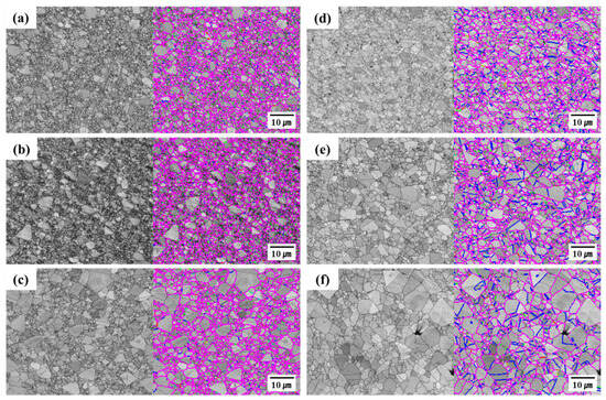 Figure 9 shows SEM micrographs and image quality maps of electrodeposited Ni foils annealed and superplastically deformed at different temperatures. Figure 9a–c correspond to samples annealed at 400 °C, 500 °C, and 600 °C without strain, respectively, and Figure 9d–f correspond to samples deformed at the same temperatures at a strain rate of 1 × 10−3 s−1. The SEM images reveal distinct twin structures predominantly within grains but fewer twins near the grain boundaries of both the annealed and superplastically deformed samples. The formation and distribution of such twin structures exhibited similar patterns in both the annealed and deformed samples, suggesting that the crystallographic texture of electrodeposited nanocrystalline Ni foils may be attributable to twin formation during both annealing and deformation. In the annealed samples, equiaxed grains lacking a distinct texture appeared at 400 °C, and annealing twins were observed within grains at 500 °C and 600 °C. This suggests that grain boundary migration during annealing was involved in the formation of the observed microstructures. The presence of twin structures in both the annealed and deformed samples indicates that the crystallographic texture of electrodeposited Ni foils formed via both grain boundary migration and twin boundary rearrangement.