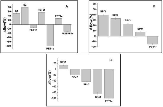 The SP composites showed decreases In fluidity with Increases In PET %wt as sand replacement (Figure 3B,C), with SPf4 (+10%) and SPc1 (−10%) showing behavior similar to the normalized mortar. The lower fluidity attributed to the addition of coarse PET is confirmed in the SPc specimens with respect to the SPf composites.