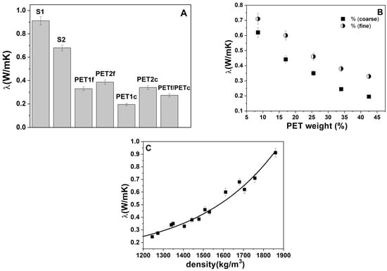 Thermal conductivity of (A) bare sand and PET composites; (B) sand/fine PET and sand/coarse PET composites as a function of waste addition. (C) Thermal conductivity as a function of the composite density. Normalized mortar thermal conductivity = 2.0 W/mK.