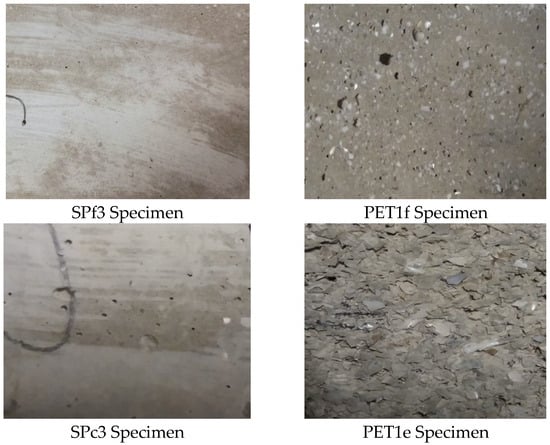 The different natures, compositions and distributions of the aggregates can be observed in Figure 2, where the sections of the specimens are shown. It can be observed that there is a good aggregate distribution in the mortars, and there are increases in PET percentage weight from S1 specimen (without PET) to the PET1f and PET1c specimens (with total sand replacement). Moreover, the different grain sizes of the organic material are evident, also in the specimen with 50% PETf and 50% PETc (PETf/PETc).