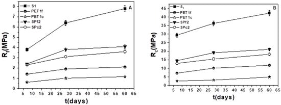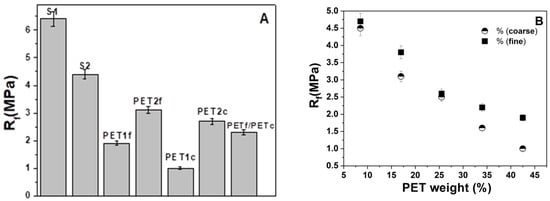Figure 8B reports the sand/fine PET (SPf) and sand/coarse PET (SPc) composites as a function of waste addition. The increase in percentage weight of plastic led to decreased mechanical strength, which was associated with increased porosity [,]. Moreover, the resistances of the PETf composites were higher than those of the PETc composites, and the difference between the two types of PET was higher with the increase in plastic addition. This result could be ascribed to the larger specific surface of the finer aggregates which induced increases in compaction and density.