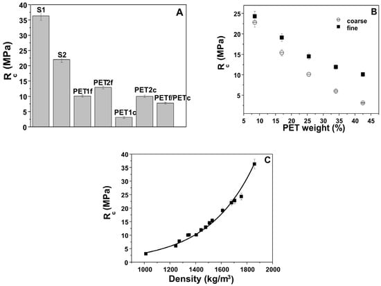 Compressive strengths of (A) bare sand and PET composites, and (B) sand/fine PET and sand/coarse PET composites as a function of waste addition. (C) Compressive strengths as a function of the composite density. Normalized mortar compressive strength = 50 MPa.