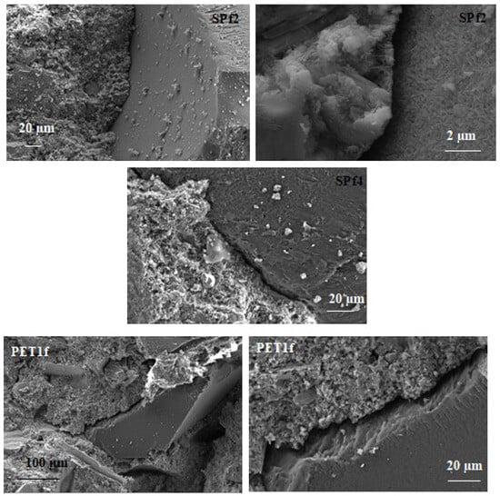 Figure 10 shows scanning electron microscopy observations for the SPf2, SPf4 and PET1f samples. It is evident that there is a lack of adhesion of the organic aggregate to the cement paste because of the different chemical nature of the conglomerate components, characterized by hydrophobic (PET) and hydrophilic (cement) domains. This is in contrast to the strong bonding observed between the cement matrix and the natural sand. As expected, the interface separation shows an enlargement with PET addition; in fact, SPf2 showed ~1.5 µm voids at the interface, SPf4 had ~3 µm voids at the interface, and PET1f ~6 µm voids. This result is ascribed to the lower cement/aggregate ratio. This enlargement with increasing amounts of PET in the mixtures caused difficulty in the workability and resulted in a more porous structure of the final products. This can also explain the decrease in the mechanical strengths that is also associated with lower PET stiffness, and the increase in thermal insulation with respect to the standard sand specimens.