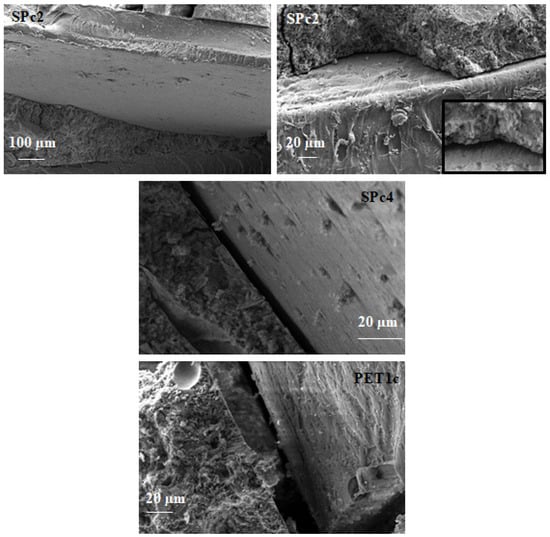 Scanning electron microscopy images for SPc2 (~2.5 µm voids at the interface), SPc4 (~7 µm voids at the interface) and PET1c (~20 µm voids at the interface).