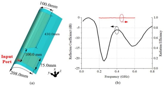 (a) The schematic diagram and (b) the reflection coefficient (black) and radiation efficiency (red) of the UHF monopole antenna.