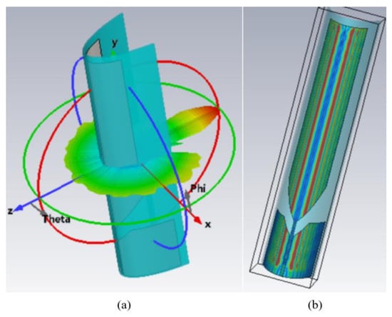 (a) The scattering beam and (b) the corresponding current distribution of the UHF monopole antenna at 10 GHz.