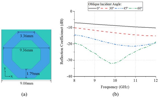 For the monopole antenna in Figure 2a, its scattering characteristics can be divided into two parts. The first type of scattering beam is caused by the direct reflected wave, which can greatly increase the RCS. To suppress the large reflection value, a squared ring absorber is proposed, as shown in Figure 4a. The periodical boundary is used to simulate the reflection performance of the absorber unit. It can be seen from Figure 4b that the absorber can achieve a −20 dB reflection coefficient in the X band. For the oblique incident waves, the reflection coefficient is below −10 dB within ±45°.
