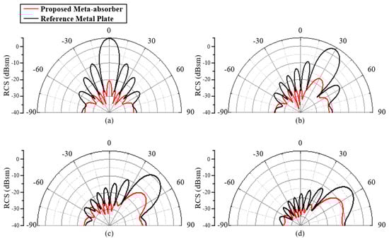 To verify the feasibility of the squared ring absorber, a plate array with 12 × 12 units is simulated to give the RCS compared to a metal plate, as shown in Figure 5. The scattering beams with different oblique incident angles are presented in Figure 6. It can be seen from Figure 6a that around a 25 dB RCS reduction is achieved for the normal incident wave, which is a significant value compared with the reference metal plate. For the RCS excited by the oblique incident waves, it also achieves scattering suppression, as shown in Figure 6b–d.