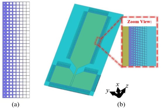 As shown in Figure 7, the taper absorber is composed of eight gradient units, and the same units are arranged repeatedly in the other direction. The material of the entire structure is still ITO film. Each unit is etched with a square hole with a gradually increasing side length. The side length of each unit is 2.5 mm, and the side lengths of the holes are 0.75 mm, 1.40 mm, 1.70 mm, 1.95 mm, 2.15 mm, 2.30 mm, 2.40 mm, and 2.45 mm, respectively. This is to achieve a gradual surface impedance transition from the antenna edge to the medium.