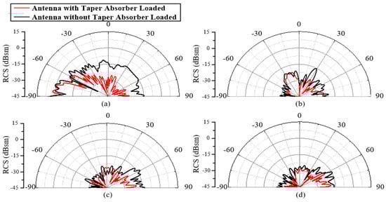 An RCS comparison of a monopole antenna with/without a taper absorber loaded. Oblique incident angles of (a) 90°, (b) 60°, (c) 30°, and (d) 0°.