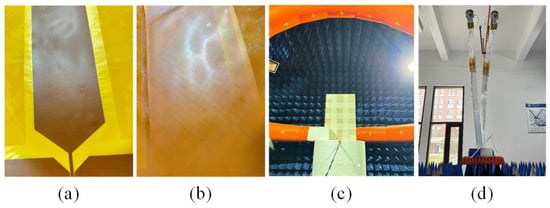 Based on the design procedure in Section 2, an antenna prototype was fabricated and measured. The layers of the monopole antenna and the ITO meta-absorber are shown in Figure 9a,b. The S-parameters of the proposed monopulse antenna array were measured utilizing an AV3672E Keysight Network Analyzer. The radiation performance of the antenna was tested in a multi-probe anechoic chamber, as illustrated in Figure 9c. The scattering characteristics of the antenna were measured using a material reflectivity and transmissivity testing system. The testing environment for the scattering characteristics is shown in Figure 9d. The antenna under test was placed horizontally on the test platform, with the transmitting and receiving horn antennas positioned at the 0° azimuth of the testing system. The difference in reflectivity between the stealth antenna and the original antenna was measured, and this value represents the radar cross section (RCS) reduction in the stealth antenna relative to the original antenna.