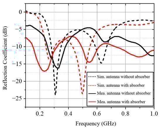 The geometry of the external absorber-loaded UHF monopole antenna is shown in Figure 2a, and it can achieve omnidirectional radiation patterns in the xoy plane. The antenna was simulated using CST STUDIO SUITE 2019. The reflection coefficient of the antenna is shown in Figure 2b. It can achieve a −6 dB impedance-matching bandwidth of 0.19 to 0.74 GHz. The radiation efficiency of the antenna is close to 1.0 in this operating band.