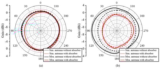 The simulated and measured S-parameters of the antenna with/without a meta-absorber loaded are compared in Figure 10. It can be seen that the results show reasonable agreement in the operating bandwidth. After loading the meta-absorber, the thin-film resistors placed around the antenna increase the overall equivalent size of the antenna, causing the resonant frequency to shift further toward the lower frequency range. Additionally, the in-band matching performance was improved. As shown in Figure 10, the measured resonant frequency of the antenna exhibits a slight deviation from the simulation results, and the depth of resonance also differs to some extent. The source of this error may be attributed to discrepancies between the dielectric constant of the honeycomb substrate used in practice and the values set in the simulation. Furthermore, during the soldering of the coaxial feed line, a window was cut into the fiberglass substrate at the bottom layer of the antenna to expose the coplanar waveguide’s signal line and ground plane for soldering. This process may also have contributed to the differences between the measured and simulated results. Nevertheless, the overall error is within an acceptable range, and the antenna’s matching performance still meets the operational requirements. The overall results sufficiently demonstrate the feasibility of the proposed design. The radiation patterns of the antenna are presented in Figure 11. The frequencies of the beams are 0.45 and 0.55 GHz. It can be observed that the antenna can achieve a good omnidirectional radiation pattern with an out-of-roundness below 4 dB. The maximum gain variation caused by the meta-absorbers is 4.2 dB, proving that meta-absorbers have a negligible impact on the radiation performance in UHF band.