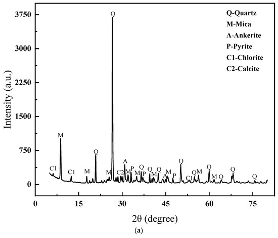 This experiment utilized lead–zinc tailings and clay as the primary raw materials. The main chemical compositions of these raw materials were determined using X-ray fluorescence (XRF), as detailed in Table 1. The XRD patterns and particle size distribution of the lead–zinc tailings are presented in Figure 1. As can be observed, the mineral components of the lead–zinc tailings consist of quartz, mica, siderite, pyrite, chlorite, and calcite. Among these, quartz and mica are particularly abundant, characterized by high diffraction peak intensities and distinct crystalline features.