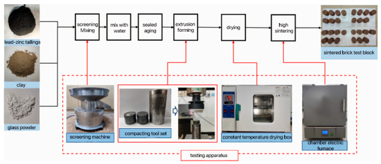 The preparation process of the sintered brick specimens was meticulously conducted as follows: Initially, the dried lead–zinc tailings, clay, and glass powder were thoroughly sieved through a 65-mesh screen to ensure a uniform particle size. Subsequently, these raw materials were precisely mixed in accordance with the predetermined ratios, and 12.5% water was carefully added to the mixture, which was then vigorously stirred to achieve homogeneity. The well-mixed material was subsequently placed into a sealed bag and subjected to aging at room temperature for a duration of 24 h. Following the aging process, the material was carefully poured into a steel mold with a diameter of Φ50 mm and a height of 50 mm, and pressed at a pressure of 20 MPa to form the specimen. The formed block was initially dried, and then meticulously placed into a box-type resistance furnace for sintering, ultimately yielding the sintered brick specimen. The detailed preparation process of sintered brick specimens is visually depicted in Figure 2.