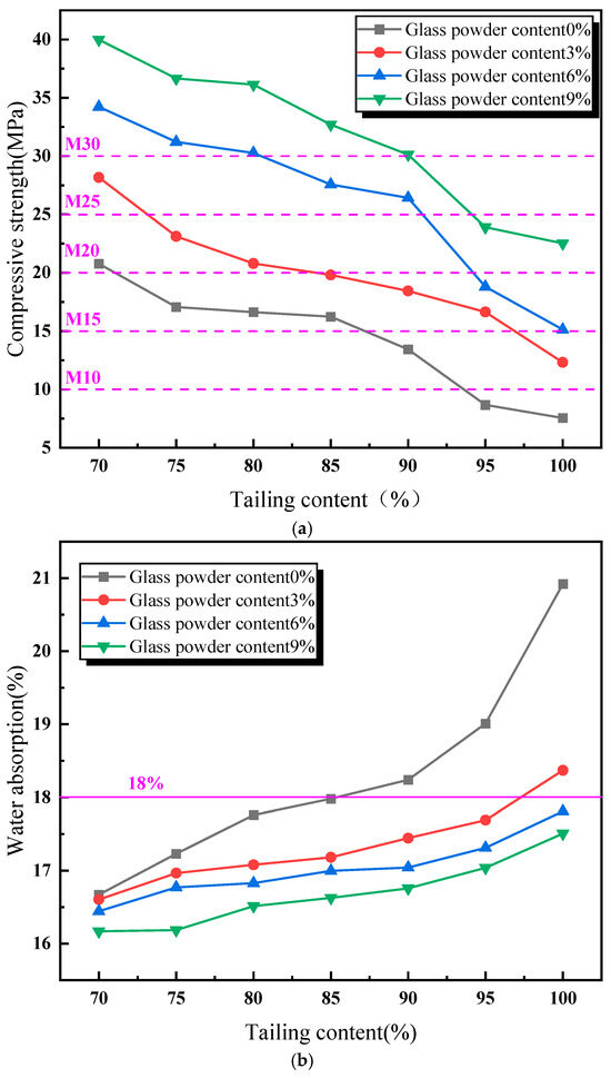 Figure 3 presents the influence of the addition of glass powder and tailing content on the compressive strength, the water absorption rate, and the volume shrinkage rate of the sintered bricks. As shown in Figure 3a, the compressive strength of the sintered bricks decreases with an increase in the content of lead–zinc tailings. The addition of glass powder has a substantial impact on improving the strength of the sintered bricks. Without the addition of glass powder, the maximum compressive strength of the sintered bricks is 20.8 MPa, which only meets the requirements of M20-grade sintered bricks, with a lead–zinc tailing content of 70%. When the glass powder content is 3%, the compressive strength of the sintered bricks with a lead–zinc tailing content of 80% still meets the M20-grade requirements. When the glass powder content reaches 6%, the compressive strength of the sintered bricks with a lead–zinc tailing content of 90% meets the M20-grade requirements. Compared with the sintered bricks without glass powder, when the glass powder content is 9%, the compressive strength of the sintered bricks with a lead–zinc tailing content of 100% meets the M20-grade requirements, and the compressive strength of the sintered bricks with a lead–zinc tailing content of 90% reaches 30.3 MPa, which meets the M30-grade strength requirements. During the high-temperature sintering process, the glass powder melts, and the generated liquid phase fills the internal voids of the sintered bricks, binding the tailings particles together, thereby enhancing the compressive strength of the sintered bricks. Moreover, the liquid melt formed significantly reduced the porosity of the sintered bricks after filling the voids.