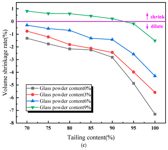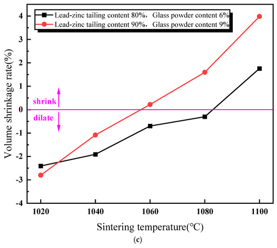 As illustrated in Figure 3c, the volume shrinkage rate of the lead–zinc tailing sintered bricks decreases with an increase in the content of lead–zinc tailings. When the glass powder content is between 0% and 6%, the volume shrinkage rate of the sintered bricks is negative, indicating that the specimens expanded in volume during the high-temperature sintering process. When the glass powder content reaches 9%, the volume shrinkage rate of sintered bricks ranges from −1.51% to 0.82%. When the lead–zinc tailing content does not exceed 90%, the volume shrinkage rate of the sintered bricks is positive. Moreover, it can be observed from the trends of the curves in Figure 3 that with an increase in glass powder content, the trend of the compressive strength curve decreasing with an increase in tailing content remains almost unchanged, while the trends of the water absorption rate and the volume shrinkage rate curves are significantly reduced.