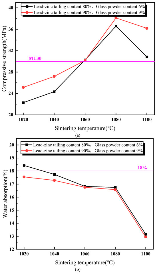 - This paper provides insights into the preparation and performance optimization of lead–zinc tailing sintered bricks. The addition of glass powder significantly enhances the compressive strength, reduces the water absorption rate, and improves the volume shrinkage rate of the sintered bricks. The optimal preparation conditions are identified as a 9% glass powder content, a 90% lead–zinc tailing content, a sintering temperature of 1060 °C, and a soaking time of 60 min.