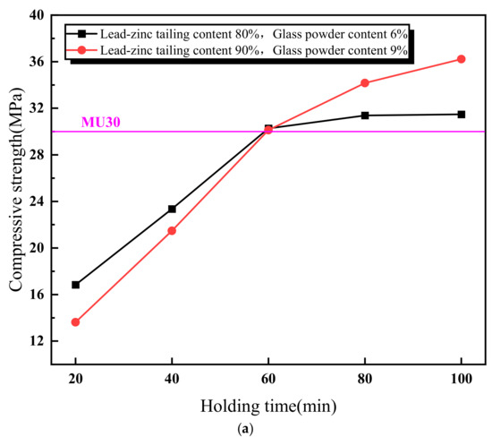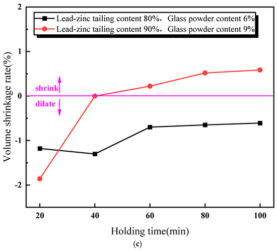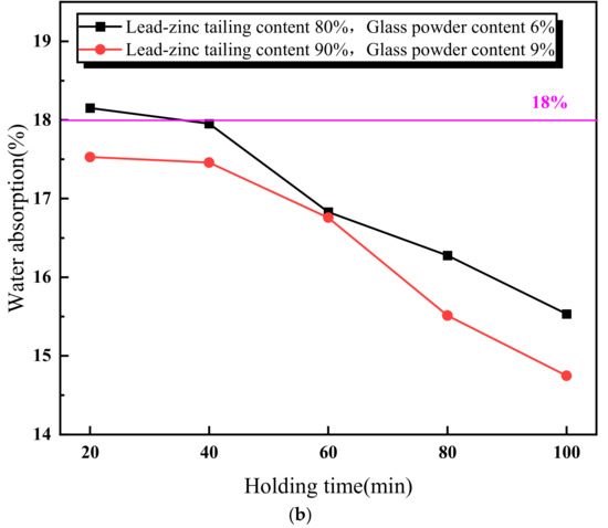 Figure 5 illustrates the relationship between the properties of the lead–zinc tailing sintered bricks and the soaking time. As shown in Figure 5a, the compressive strength of the sintered bricks increases with the increase in soaking time. When the soaking time exceeds 60 min, the compressive strength meets the M30-strength-grade requirement. Additionally, the rate of increase in compressive strength slows down when the soaking time is above 60 min. Figure 5b shows the relationship between the water absorption rate of the sintered bricks and soaking time. The water absorption rate decreases continuously with increasing soaking time. When the soaking time reaches 40 min, the water absorption rate of the sintered bricks with both the material mixtures meets the required standard. Figure 5c indicates that the effect of soaking time on the volume shrinkage rate of the sintered bricks with 6% glass powder and 80% lead–zinc tailings is relatively weak. The volume shrinkage rate of these bricks fluctuates slightly upward with increasing soaking time and remains negative, indicating that volume expansion is the dominant factor. For the sintered bricks with 9% glass powder and 90% lead–zinc tailings, the volume shrinkage rate increases from −1.86% to −0.01% when the soaking time increases from 20 min to 40 min. When the soaking time reaches 60 min and above, the volume shrinkage rate becomes positive.