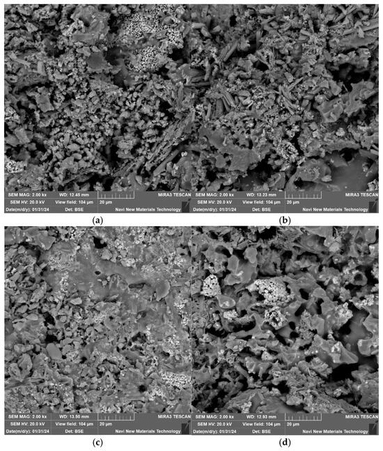 Under the conditions of a forming pressure of 20 MPa, a sintering temperature of 1060 °C, a lead–zinc tailing content of 90%, and a soaking time of 60 min, the microstructures of the lead–zinc tailing sintered bricks with different glass powder contents are shown in Figure 7. When the glass powder content is 0%, the glassy substances in the sintered bricks exist primarily in the form of microspheres, and the overall structure is relatively loose, with a large number of micropores present, some of which are interconnected. When the glass powder content is 3% and 6%, extensive glassy substances begin to appear, and the number of pores gradually decreases, indicating that the addition of glass powder promotes an increase in the amount of melt within the sintered bricks. When the glass powder content reaches 9%, more blocky, irregular glassy substances and surrounding crystalline structures can be observed, and the cross-section of the sintered bricks becomes more compact. These glassy substances are the products of the cooling of the molten liquid phase, and they interconnect with each other, effectively isolating the ingress of water. The addition of glass powder is more conducive to the formation and distribution of these glass phases, which can transform the skeletal structure of the bricks from “loose” to “monolithic”, thereby enhancing the cohesion of the specimens and strengthening their resistance to destruction. Macroscopically, this contributes to the improvement of the compressive strength and elastic modulus of the sintered bricks.