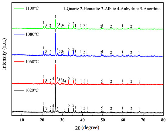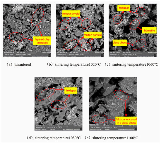 As depicted in Figure 9, the particles of the unsinistered specimens have distinct edges and corners, with the layered clay minerals being more pronounced, and the contact between particles is relatively loose. When the sintering temperature is 1020 °C, the edges and corners of some particles are almost eliminated, and the surfaces become slightly spherical. Meanwhile, the formation of mineral crystals and the appearance of numerous micropores between particles can be observed. This is because under the influence of a high temperature, the particle surfaces undergo melting, forming spherical glassy phases. At the same time, some substances disappear to form pores, and new mineral crystals are generated. As the sintering temperature increases, the development of feldspar crystals accelerates, and the glass powder further melts, leading to an increase in the high-temperature molten liquid phase. Figure 9c,d shows that the long-columnar feldspar crystals gradually increase in number, and the distribution of glassy substances expands. Feldspar, quartz, and the glassy phase are closely integrated, forming a “monolithic” dense structure. This structure can enhance the attraction between particles and resist external disturbances. Macroscopically, it is manifested as an improvement in the strength properties of the sintered bricks and a reduction in water absorption. When the sintering temperature is 1100 °C, the surface of the specimen becomes smooth and flat, and the mineral crystals are almost entirely enveloped by the glassy substances. The number of feldspar crystals decreases, and their crystalline structure is no longer distinct. This indicates that at a sintering temperature of 1100 °C, the glass powder melts more rapidly, and more quartz and feldspar participate in the melting reaction, generating a large amount of liquid phase material. These liquid phase materials envelop the crystalline structures, significantly reducing the number of pores and weakening the supporting role of the particle framework. Macroscopically, this is manifested as a weakening of the strength properties of the sintered bricks.