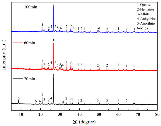 The XRD patterns of the sintered bricks at different soaking times is shown in Figure 10. It can be observed that when the soaking time is 20 min, mica minerals are still present in the sintered bricks, indicating that the decomposition of some minerals had fully completed due to the insufficient soaking time. As the soaking time is extended, the amount of mica gradually decreases, while the amount of feldspar minerals increases. This is because the decomposition of mica can generate SiO2 and Al2O3, which are essential components for the formation of feldspar. The liquid phase in the system interacts with the remaining solid particles and crystals, promoting a more compact structure. Therefore, as the soaking time increases, the compressive strength of the sintered bricks continuously improves, and their permeability gradually decreases.