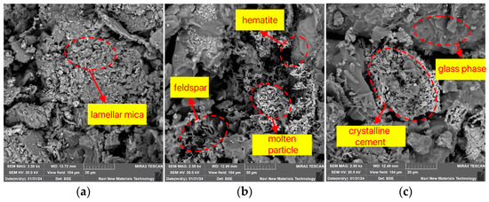 Figure 11 illustrates the effect of soaking time on the internal microstructure of the sintered bricks. When the soaking time is 20 min, unreacted mica particles with a layered structure can be observed, and the distribution of newly formed mineral crystals and glassy substances is sparse. At this point, the contact between the sample particles is relatively loose, and the skeletal structure is not dense enough. As the soaking time increases, Figure 11b clearly shows that the sample particles exhibit melting phenomena, with an increased distribution of feldspar mineral crystals and the appearance of large areas of glassy substances and mineral crystallization. Subsequently, the liquid phase further increases in quantity, with a more uniform and extensive distribution, ultimately forming blocky glass phases and dense crystalline bonds, as shown in Figure 11c. Macroscopically, this enhances the strength properties of the sintered bricks.