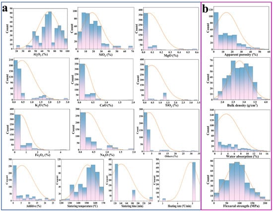 The data distribution of (a) chemical compositions, sintering process parameters, and (b) properties of mullite–corundum ceramic materials.