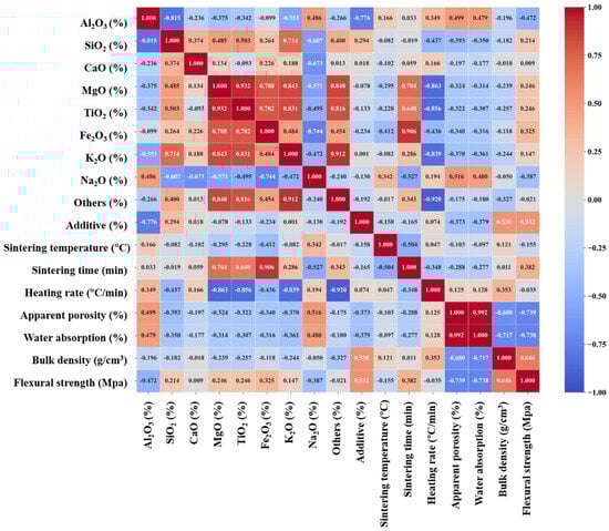 To evaluate whether the considered input variables can provide valuable information for ML model development to predict mullite–corundum ceramic properties, we conducted the Pearson correlation analysis to roughly understand the correlations between inputs and outputs. The higher Pearson correlation coefficient meant a higher correlation with output, and a negative value represented a negative relationship.