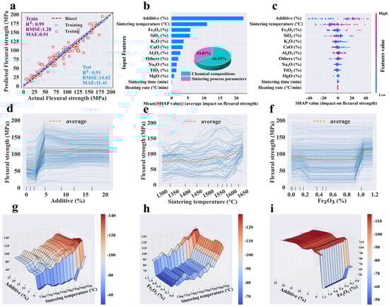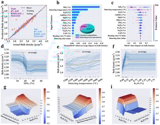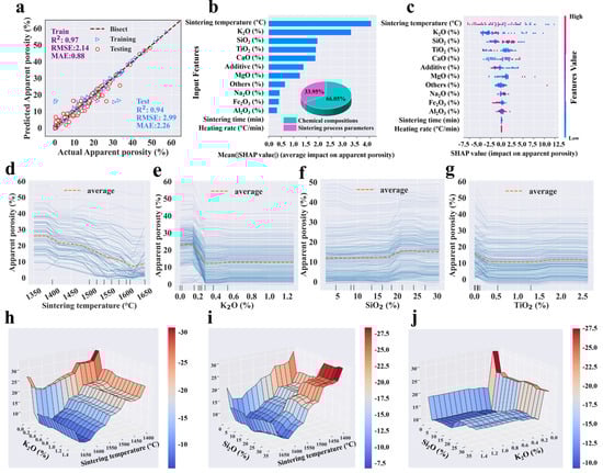 In detail, for apparent porosity, the sintering temperature, K2O, SiO2, and TiO2 were the top four most important features among input variables based on SHAP analysis (Figure 3b). Similarly, for bulk density, those features were SiO2, sintering temperature, and K2O in order of importance level (Figure 4b). Most data points of high apparent porosity values yielded positive SHAP values, which indicated that higher sintering temperature led to higher apparent porosity, as did K2O (Figure 3b). In terms of bulk density, SiO2 and sintering temperature were most important (Figure 4b).
