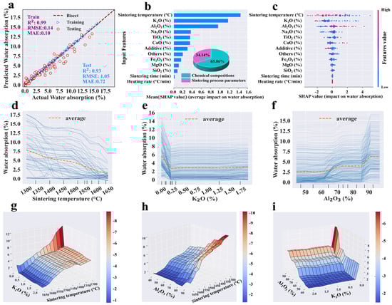 The top features for water absorption were sintering temperature, K2O, and Al2O3 in order of importance level (Figure 5b). As the sintering temperature elevated, the water absorption of the ceramic consistently diminished from about 7.8% to 1.5% (Figure 5d). Similarly, water absorption sharply decreased as K2O increased from 0% to 0.22%, stabilizing at 2.7% (Figure 5e). These results might be due to improved densification and reduced liquid-phase viscosity [60,61]. Therefore, the sintering temperature and K2O had a synergistic effect on the water absorption (Figure 5g). The water absorption value exhibited a fluctuating increase with the rise in Al2O3, as excessive Al2O3 content acted as a network modifier, increasing viscosity and hindering vitrification [62].