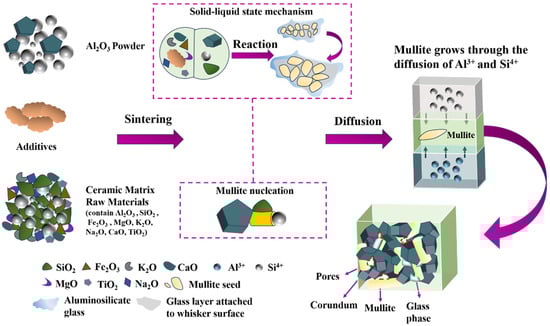 A possible schematic diagram of the sintering mechanism of mullite–corundum ceramics is shown in Figure 7. The sintering mechanism may include two processes: mullite nucleation and growth. The introduction of additives and certain alkali oxides, such as K2O, Fe2O3, etc., may reduce the liquid-phase viscosity at high temperatures. This could potentially accelerate the diffusion of Si4⁺, promote the growth and grain size of mullite, and enhance the densification and physical properties of the sample [68,69,70].