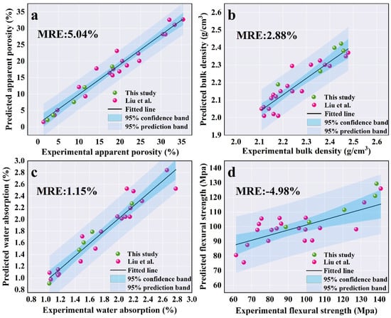 Five groups of experiments (Table S2) were utilized to validate the accuracy of the ML model in predicting the critical properties of mullite–corundum ceramics. The specifics of the experimental validation results are presented in Table S2 and Figure S6 and Figure 8, demonstrating the accuracy of the predictive models for key properties of mullite–corundum ceramics. The relative errors (Re) listed in Table S2 indicate that the predicted values closely match the experimental values, with most Re values falling within 30%, which is acceptable. In addition, most data points align well with the fitted line and fall within the 95% confidence and prediction bands, with mean relative errors (MRE) < 5.10% (Figure 8). Comparing the experimental results from this study (green points) with those from Liu et al. (red points) [45], lower errors are observed, particularly in predicting bulk density and apparent porosity, with most data points falling within the 95% confidence and prediction bands. However, larger discrepancies were observed for properties such as flexural strength, especially at higher sintering temperatures, where relative errors exceed 20% in some cases. This may be attributable to the limited data available for training and potential limitations in the model’s complexity. The combination of the table and figure demonstrates the model’s reliability while highlighting specific areas where the predictive accuracy could be enhanced.