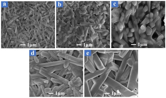 Additionally, images of sample B4 sintered at different temperatures are presented in Figure 9. At 1480 °C (Figure 9a), the microstructure consisted of fine, elongated mullite grains with noticeable porosity. As the sintering temperature increased to 1500 °C (Figure 9b) and 1530 °C (Figure 9c), the grains grew larger, and the porosity reduced, consistent with the predicted decrease in apparent porosity and water absorption and the predicted increase in bulk density. At 1560 °C (Figure 9d) and 1580 °C (Figure 9e), the densification became even more pronounced, with larger, well-packed grains and minimal porosity which aligned with the model’s prediction of improved mechanical strength. The observed reduction in porosity and more tightly packed grains contributed to the increased flexural strength and reduced water absorption at these higher sintering temperatures, thereby supporting the accuracy of the model’s predictions.