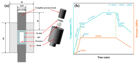 (a) Graphite mold cross-section and 3D drawing; (b) SPS process curve.