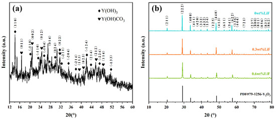 Figure 2 shows the X-ray diffraction patterns of precursor and Y1.8La0.2O3 transparent ceramics sintered at 1550 °C doped with 0 wt.%, 0.3 wt.% and 0.6 wt.% LiF. It can be seen from Figure 2a that the precursor is mainly composed of Y (OH)3 (JCPDS NO. 24-1447) and Y (OH)CO3 (JCPDS NO. 30-1444). The unmarked peaks may be compounds of C, H, O, etc., which can be removed after calcination. As evidenced by Figure 2b, the XRD pattern of Y1.8La0.2O3 transparent ceramics exhibits diffraction peaks of the cubic Y2O3 phase (JCPDS NO. 79-1256) without a second phase.