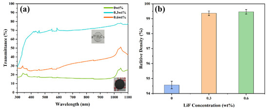 Transmittance curves of Y1.8La0.2O3 ceramics at 300–1100 nm wavelength are shown in Figure 3a. The Y1.8La0.2O3 ceramic, without adding LiF, is black and completely opaque. Its maximum transmittance is only 23.63% due to being severely contaminated by carbon. After adding 0.3 wt.% LiF, the black part on the Y1.8La0.2O3 ceramic is almost invisible. The maximum transmittance is 78.10%, and the words under the ceramic can be clearly seen. This is mainly attributed to the two roles played by LiF in the SPS process. One role is the cleaning effect, which can reduce the diffusion of carbonaceous gases into ceramics [33,34] and reduce the carbon pollution of transparent ceramics. The other role is the liquid phase sintering aid. Combined with the study of Naum Frage et al. [35], the reaction process can be expressed as Equations (1) and (2), respectively: