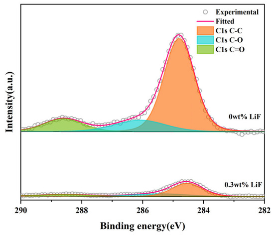 Figure 4 shows the C1s spectra of the Y1.8La0.2O3 transparent ceramics doped with 0.3 wt.% LiF and undoped LiF before annealing at 900 °C for 3 h. After comparing the intensity of the C1s peaks of the two transparent ceramics, it can be found that the carbon content of Y1.8La0.2O3 transparent ceramics decreased significantly [37] after doping 0.3 wt.% LiF, which indicates that the doping of LiF can reduce carbon pollution during the SPS process.