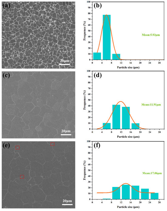 Microstructure and grain size distribution of Y1.8La0.2O3 ceramics sintered at 1550 °C with (a,b) 0 wt.% LiF, (c,d) 0.3 wt.% LiF, and (e,f) 0.6 wt.% LiF.