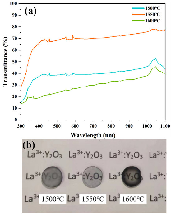 Figure 7a shows the transmittance curves of Y1.8La0.2O3 ceramics doped with 0.3 wt.% LiF sintered at different sintering temperatures. The transmittance increases when the sintering temperature increases from 1500 °C to 1550 °C. It is mainly due to the decrease in the total grain boundary area through the gradual growth of the grains, which can decrease the light scattering loss and the optical scattering coefficient of the ceramics [41]. The transmittance of the ceramic, whose central part is dark yellow and the surrounding part is black (Figure 7b), decreases rapidly when the sintering temperature increases to 1600 °C. The reason for this phenomenon may be that the higher sintering temperature leads to the enhancement of carbon diffusion, which makes the ceramics suffer more serious carbon pollution.