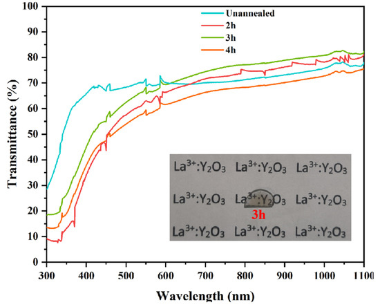 Although oxygen vacancies can promote the densification of ceramics, they also cause a decrease in the transmittance of ceramics [43]. Annealing can reduce the number of oxygen vacancies and the residual carbon pollution in transparent ceramics because the partial pressure of oxygen in the air is higher than inside the transparent ceramics, and the high temperature provides enough diffusion power to make the combination of oxygen atoms and oxygen vacancies [44]. Figure 9 shows the transmittance curves of Y1.8La0.2O3 transparent ceramics with 0.3 wt.% LiF is annealed at 900 °C for different time. Compared to the unannealed samples, the transmittance increases after annealing for 2 h and 3 h, respectively. The best transmittance of 82.67% can be obtained by annealing for 3 h. The transmittance decreases slightly after annealing for 4 h.