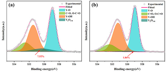 Figure 10 shows the O1s spectra of the sintered Y1.8La0.2O3 transparent ceramics and annealed Y1.8La0.2O3 transparent ceramics at 900 °C for 3 h, respectively. A subpeak of reduced yttrium oxide is found in the region around 530.4 eV [45]. It can be found that the area ratio occupied by the subpeak of reduced yttrium oxide decreases from 7.52% to 1.84% after annealing at 900 °C for 3 h. This indicates that annealing can effectively remove the oxygen vacancies inside the transparent ceramics.