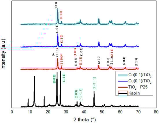 - Li, X.; Zhang, Q.; Guo, Y.; Shi, H.; Wang, J.; Cheng, X. Synthesis and characterization of Cu and Co doped TiO2/kaolin composites for photocatalytic degradation of organic pollutants. J. Environ. Chem. Eng. 2017, 5, 4876–4884. [Google Scholar] [CrossRef]