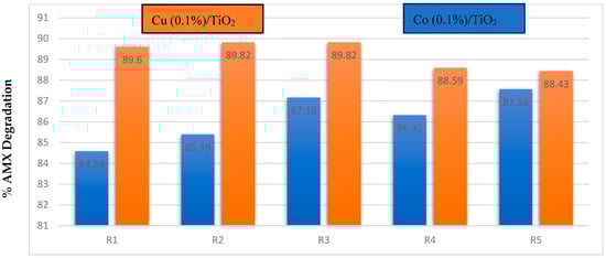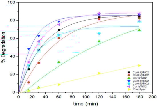 | Photocatalyst | Cu (0.1%)/TiO2 | Co (0.1%)/TiO2 | ||